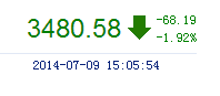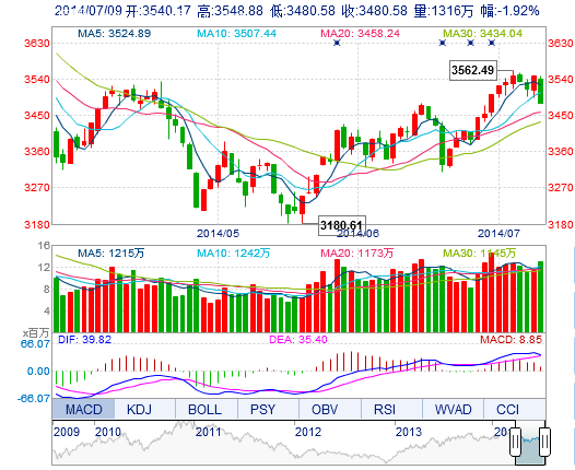 今開: 3540.17 最高: 3548.88 昨收: 3548.77 最低: 3480.58 成交量: 1316.37萬(wan) 手 振幅: 1.92% 成交額: 234.52億(yi) 元