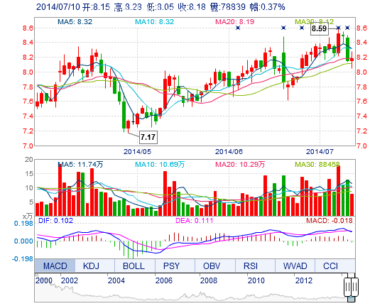 | 今 開: | 8.15 | 成交量: | 7.88萬手 | 振 幅: | 2.82% |