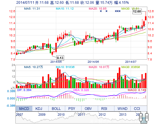 | 今 開: | 11.68 | 成交量: | 15.74萬手 | 振 幅: | 7.94% |