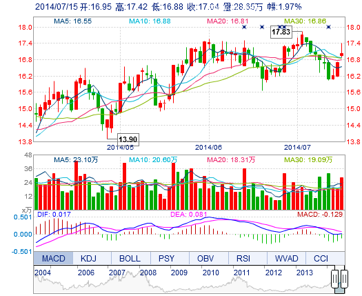 | 今 開: | 16.95 | 成交量: | 28.65萬手 | 振 幅: | 3.23% |