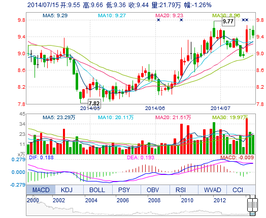 | 今 開: | 9.55 | 成交量: | 21.79萬手 | 振 幅: | 3.14% |