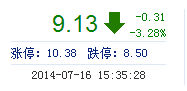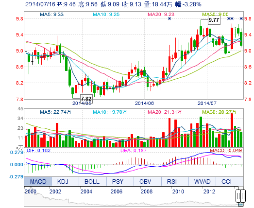 今開: 9.46 成交量: 18.44萬(wan) 手 振幅: 4.98% 最高: 9.56 成交額: 1.72億(yi) 元 換手率: 2.07% 最低: 9.09 總市值: 81.36億(yi) 市淨率: 3.04 昨收: 9.44 流通市值: 81...