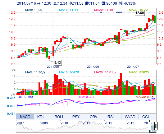 今開: 12.30 成交量: 9.01萬(wan) 手 振幅: 6.13% 最高: 12.34 成交額: 1.07億(yi) 元 換手率: 4.52% 最低: 11.58 總市值: 23.19億(yi) 市淨率: 4.68 昨收: 12.40 流通市值:...