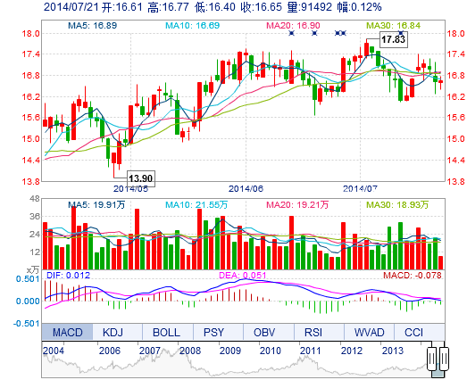 今開: 16.61 成交量: 9.15萬(wan) 手 振幅: 2.22% 最高: 16.77 成交額: 1.52億(yi) 元 換手率: 0.96% 最低: 16.40 總市值: 175.75億(yi) 市淨率: 4.77 昨收: 16.63 流通市值...