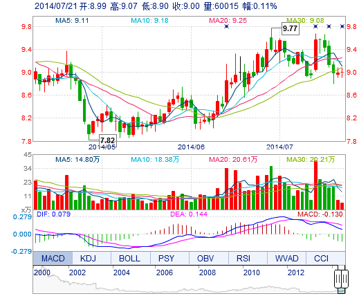 | 今 開: | 8.99 | 成交量: | 6.00萬手 | 振 幅: | 1.89% |