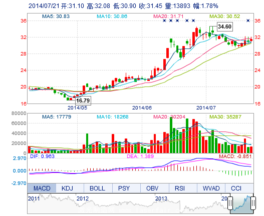 | 今 開: | 31.10 | 成交量: | 1.39萬手 | 振 幅: | 3.82% |