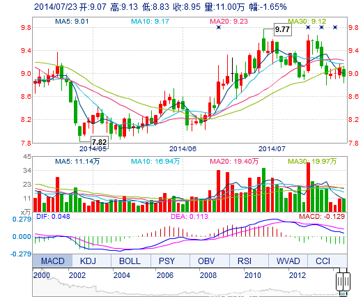 | 今 開: | 9.07 | 成交量: | 11.00萬手 | 振 幅: | 3.30% |