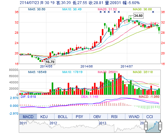 | 今 開: | 30.19 | 成交量: | 2.09萬手 | 振 幅: | 8.68% |