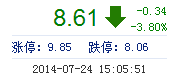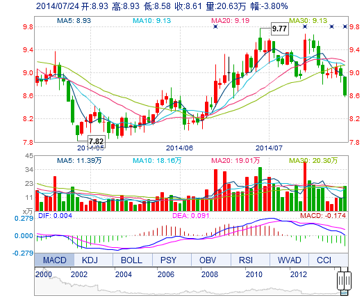 今開: 8.93 成交量: 20.63萬(wan) 手 振幅: 3.91% 最高: 8.93 成交額: 1.80億(yi) 元 換手率: 2.32% 最低: 8.58 總市值: 76.73億(yi) 市淨率: 2.87 昨收: 8.95 流通市值: 76...