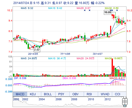 今開: 9.15 成交量: 16.80萬(wan) 手 振幅: 3.68% 最高: 9.31 成交額: 1.54億(yi) 元 換手率: 3.85% 最低: 8.97 總市值: 40.27億(yi) 市淨率: 2.89 昨收: 9.24 流通市值: 40...
