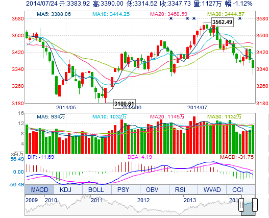 今開: 3383.92 最高: 3390.00 昨收: 3385.79 最低: 3314.52 成交量: 1127.19萬(wan) 手 振幅: 2.23% 成交額: 166.82億(yi) 元