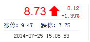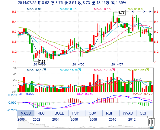 今開: 8.62 成交量: 13.46萬(wan) 手 振幅: 2.90% 最高: 8.76 成交額: 1.16億(yi) 元 換手率: 1.51% 最低: 8.51 總市值: 77.79億(yi) 市淨率: 2.91 昨收: 8.61 流通市值: 77...