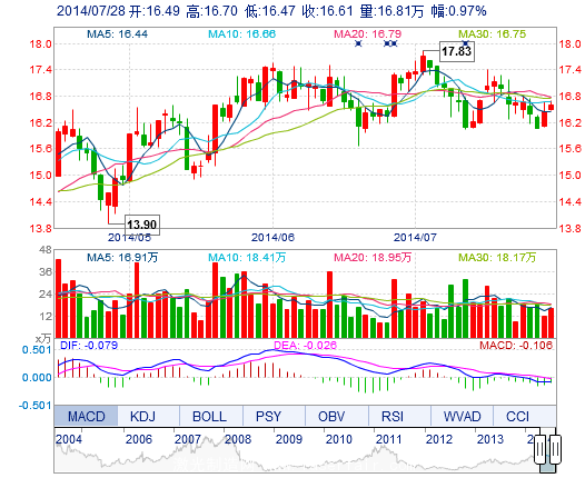 今開: 16.49 成交量: 16.81萬(wan) 手 振幅: 1.40% 最高: 16.70 成交額: 2.79億(yi) 元 換手率: 1.76% 最低: 16.47 總市值: 175.33億(yi) 市淨率: 4.76 昨收: 16.45 流通市值...