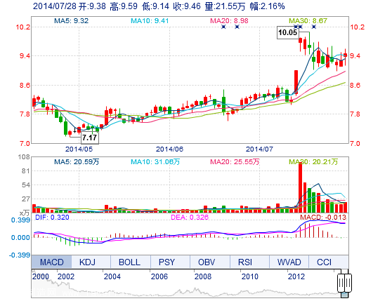 今開: 9.38 成交量: 21.55萬(wan) 手 振幅: 4.86% 最高: 9.59 成交額: 2.02億(yi) 元 換手率: 4.93% 最低: 9.14 總市值: 41.32億(yi) 市淨率: 2.97 昨收: 9.26 流通市值: 41...