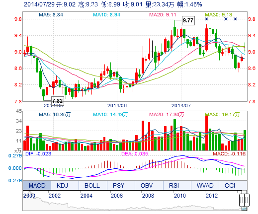 今開: 9.02 成交量: 23.34萬(wan) 手 振幅: 2.70% 最高: 9.23 成交額: 2.13億(yi) 元 換手率: 2.62% 最低: 8.99 總市值: 80.29億(yi) 市淨率: 3.00 昨收: 8.88 流通市值: 80...