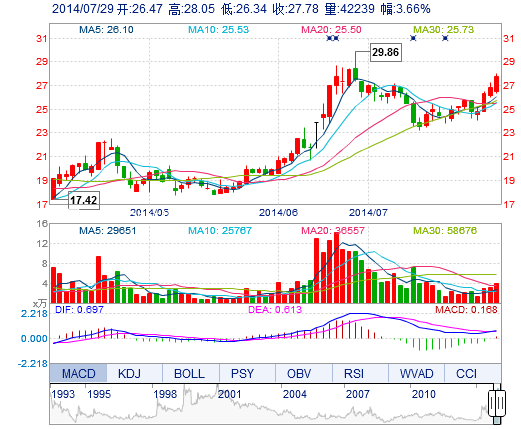 今開: 26.47 成交量: 4.22萬(wan) 手 振幅: 6.38% 最高: 28.05 成交額: 1.17億(yi) 元 換手率: 2.43% 最低: 26.34 總市值: 48.25億(yi) 市淨率: 13.95 昨收: 26.80 流通市值...