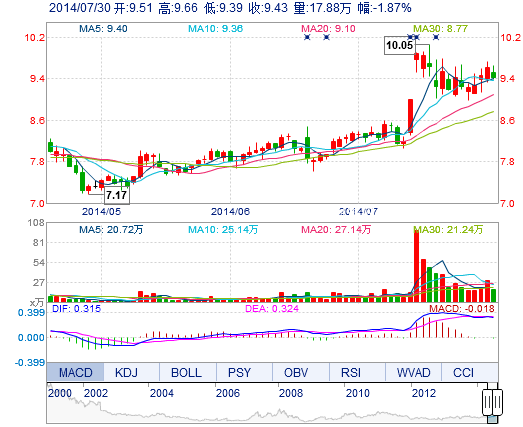 今開: 9.51 成交量: 17.88萬(wan) 手 振幅: 2.81% 最高: 9.66 成交額: 1.70億(yi) 元 換手率: 4.09% 最低: 9.39 總市值: 41.19億(yi) 市淨率: 2.96 昨收: 9.61 流通市值: 41...