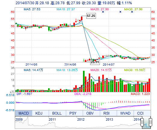 今開: 28.18 成交量: 19.89萬(wan) 手 振幅: 2.82% 最高: 28.78 成交額: 5.63億(yi) 元 換手率: 3.14% 最低: 27.99 總市值: 185.32億(yi) 市淨率: 10.90 昨收: 27.99 流通市...