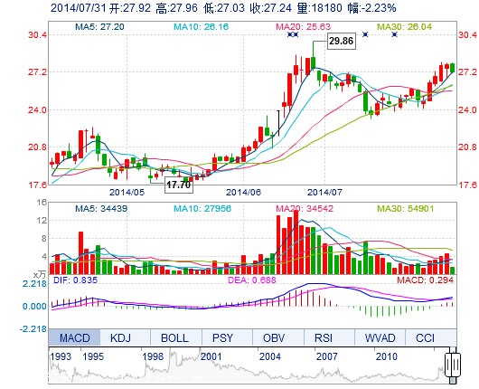 | 今 開: | 27.92 | 成交量: | 1.82萬手 | 振 幅: | 3.34% |