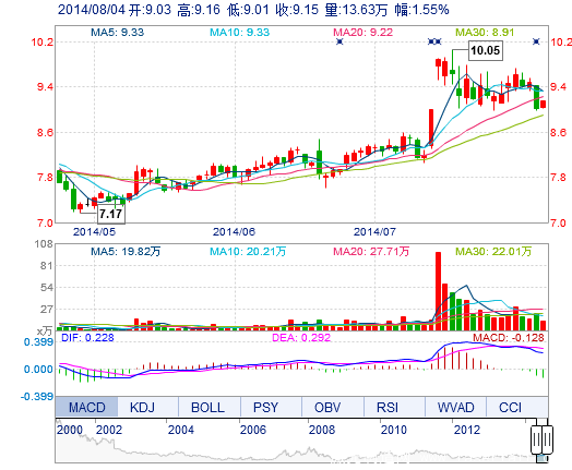 | 今 開: | 9.03 | 成交量: | 13.63萬手 | 振 幅: | 1.66% |