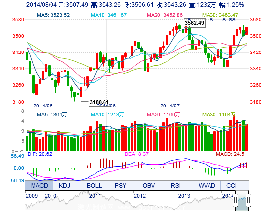 今開: 3507.49 最高: 3543.26 昨收: 3499.57 最低: 3506.61 成交量: 1232.36萬(wan) 手 振幅: 1.05% 成交額: 186.24億(yi) 元