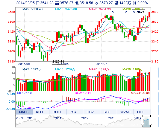 今開: 3541.28 最高: 3578.27 昨收: 3543.26 最低: 3518.58 成交量: 1423.36萬(wan) 手 振幅: 1.68% 成交額: 225.37億(yi) 元