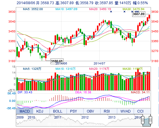 今開: 3568.73 最高: 3607.89 昨收: 3578.27 最低: 3558.79 成交量: 1410.09萬(wan) 手 振幅: 1.37% 成交額: 207.21億(yi) 元