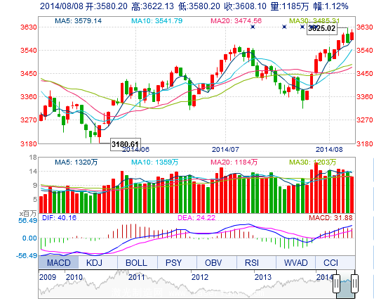 今開: 3580.20 最高: 3622.13 昨收: 3568.23 最低: 3580.20 成交量: 1184.56萬(wan) 手 振幅: 1.18% 成交額: 196.56億(yi) 元
