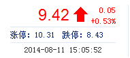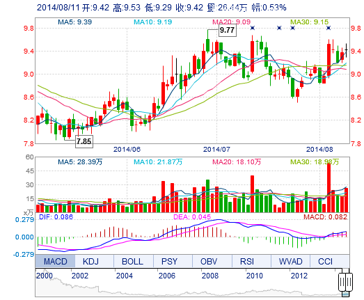 今開: 9.42 成交量: 26.44萬(wan) 手 振幅: 2.56% 最高: 9.53 成交額: 2.49億(yi) 元 換手率: 2.97% 最低: 9.29 總市值: 83.94億(yi) 市淨率: 3.14 昨收: 9.37 流通市值: 83...