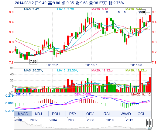 | 最 高: | 9.80 | 成交額: | 3.68億元 | 換手率: | 4.29% |