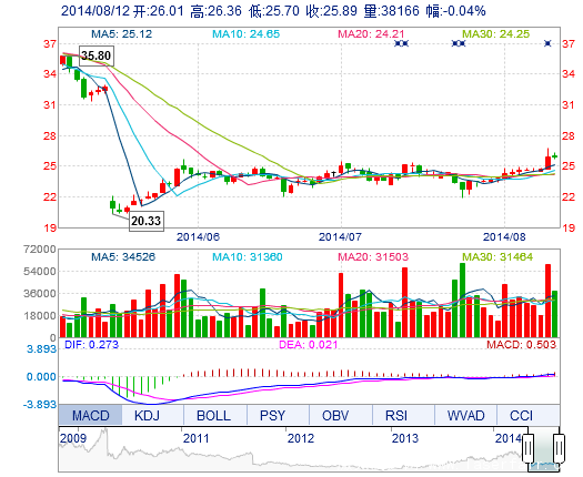 今開: 26.01 成交量: 3.82萬(wan) 手 振幅: 2.55% 最高: 26.36 成交額: 9918.74萬(wan) 元 換手率: 0.73% 最低: 25.70 總市值: 168.80億(yi) 市淨率: 6.43 昨收: 25.90 流通市...
