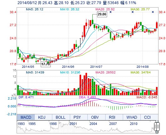 | 最 高: | 28.10 | 成交額: | 1.46億元 | 換手率: | 3.09% |