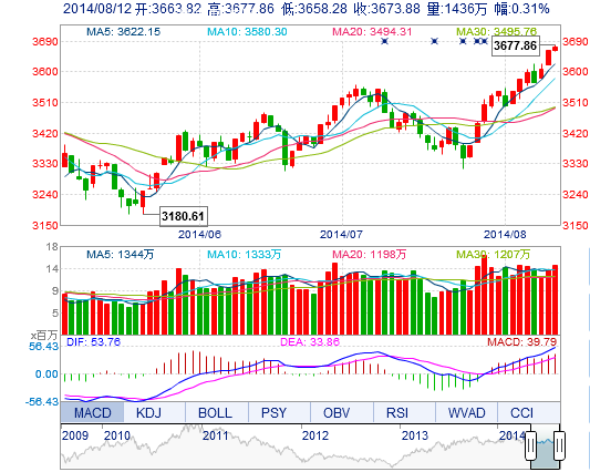 今開: 3663.82 最高: 3677.86 昨收: 3662.68 最低: 3658.28 成交量: 1435.99萬(wan) 手 振幅: 0.53% 成交額: 228.05億(yi) 元