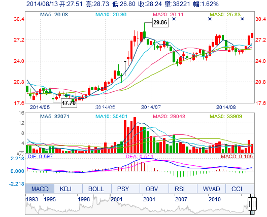 | 最 高: | 28.73 | 成交額: | 1.06億元 | 換手率: | 2.20% |