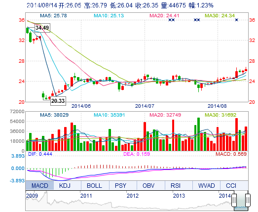 今開: 26.05 成交量: 4.47萬(wan) 手 振幅: 2.88% 最高: 26.79 成交額: 1.18億(yi) 元 換手率: 0.86% 最低: 26.04 總市值: 171.80億(yi) 市淨率: 6.55 昨收: 26.03 流通市值...