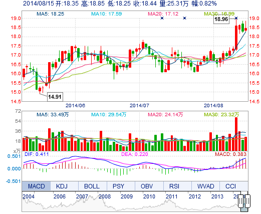 今開: 18.35 成交量: 25.31萬(wan) 手 振幅: 3.28% 最高: 18.85 成交額: 4.70億(yi) 元 換手率: 2.65% 最低: 18.25 總市值: 194.65億(yi) 市淨率: 5.28 昨收: 18.29 流通市值...