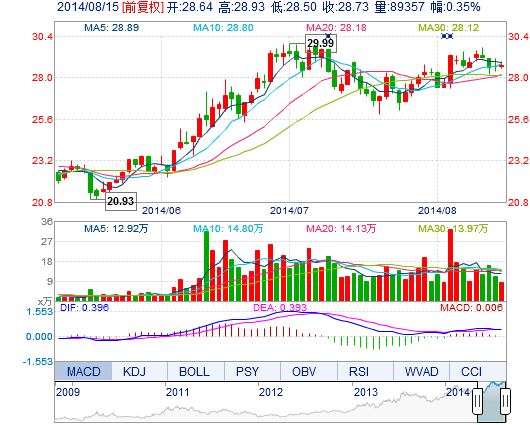今開: 28.64 成交量: 8.94萬(wan) 手 振幅: 1.50% 最高: 28.93 成交額: 2.57億(yi) 元 換手率: 1.41% 最低: 28.50 總市值: 188.14億(yi) 市淨率: 11.07 昨收: 28.63 流通市值...