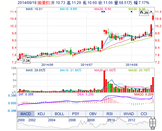 | 最 高: | 11.29 | 成交額: | 7.47億元 | 換手率: | 15.68% |