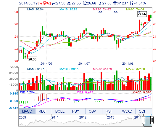 今開: 27.50 成交量: 4.12萬(wan) 手 振幅: 3.57% 最高: 27.66 成交額: 1.12億(yi) 元 換手率: 0.79% 最低: 26.68 總市值: 176.96億(yi) 市淨率: 9.73 昨收: 27.44 流通市值...