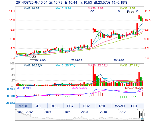 | 最 高: | 10.79 | 成交額: | 2.50億元 | 換手率: | 5.40% |