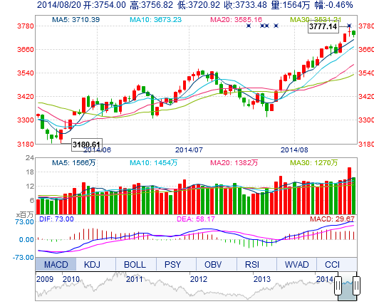今開: 3754.00 最高: 3756.82 昨收: 3750.62 最低: 3720.92 成交量: 1564.10萬(wan) 手 振幅: 0.96% 成交額: 259.07億(yi) 元