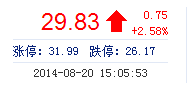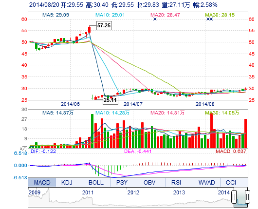 今開: 29.55 成交量: 27.11萬(wan) 手 振幅: 2.92% 最高: 30.40 成交額: 8.12億(yi) 元 換手率: 4.28% 最低: 29.55 總市值: 195.34億(yi) 市淨率: 11.49 昨收: 29.08 流通市...