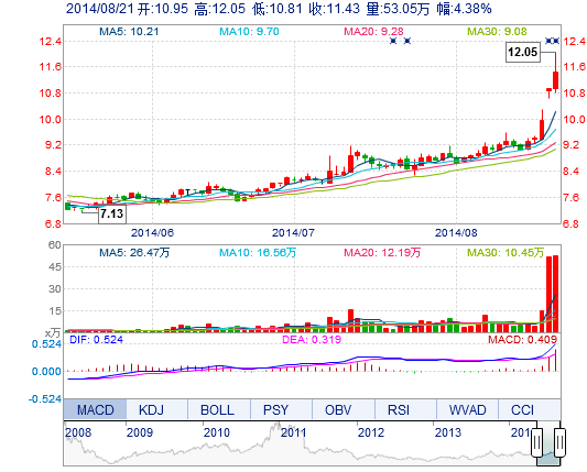 今開: 10.95 成交量: 53.05萬(wan) 手 振幅: 11.32% 最高: 12.05 成交額: 6.10億(yi) 元 換手率: 19.30% 最低: 10.81 總市值: 32.58億(yi) 市淨率: 5.08 昨收: 10.95 流通市...