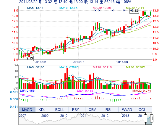今開: 13.32 成交量: 5.62萬(wan) 手 振幅: 3.08% 最高: 13.40 成交額: 7402.09萬(wan) 元 換手率: 2.83% 最低: 13.00 總市值: 26.18億(yi) 市淨率: 5.24 昨收: 13.00 流通市...