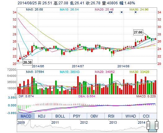 今開: 26.51 成交量: 4.08萬(wan) 手 振幅: 2.54% 最高: 27.08 成交額: 1.10億(yi) 元 換手率: 0.78% 最低: 26.41 總市值: 175.00億(yi) 市淨率: 9.62 昨收: 26.39 流通市值...