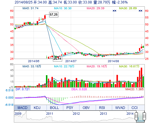 今開: 34.00 成交量: 28.79萬(wan) 手 振幅: 5.14% 最高: 34.74 成交額: 9.70億(yi) 元 換手率: 4.54% 最低: 33.00 總市值: 216.63億(yi) 市淨率: 12.74 昨收: 33.88 流通市...
