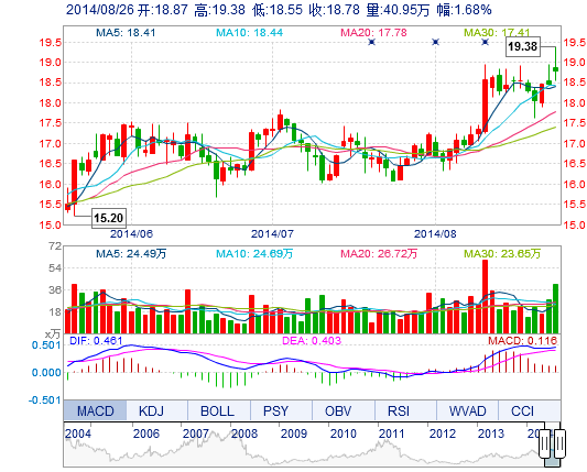 今開: 18.87 成交量: 40.95萬(wan) 手 振幅: 4.49% 最高: 19.38 成交額: 7.78億(yi) 元 換手率: 4.28% 最低: 18.55 總市值: 198.24億(yi) 市淨率: 5.38 昨收: 18.47 流通市值...