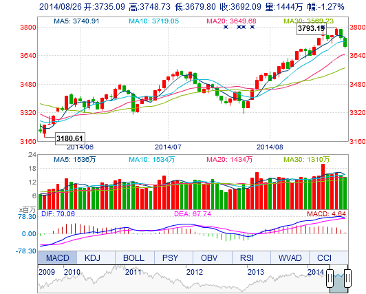 今開: 3735.09 最高: 3748.73 昨收: 3739.69 最低: 3679.81 成交量: 1443.61萬(wan) 手 振幅: 1.84% 成交額: 266.23億(yi) 元