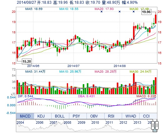 今開: 18.83 成交量: 48.90萬(wan) 手 振幅: 6.02% 最高: 19.96 成交額: 9.59億(yi) 元 換手率: 5.11% 最低: 18.83 總市值: 207.99億(yi) 市淨率: 5.65 昨收: 18.78 流通市值...
