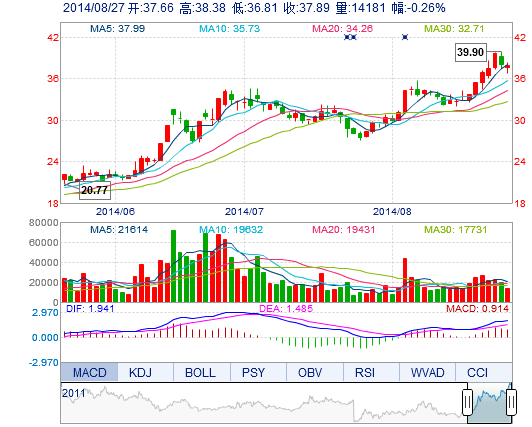 | 今 開: | 37.66 | 成交量: | 1.42萬手 | 振 幅: | 4.13% |